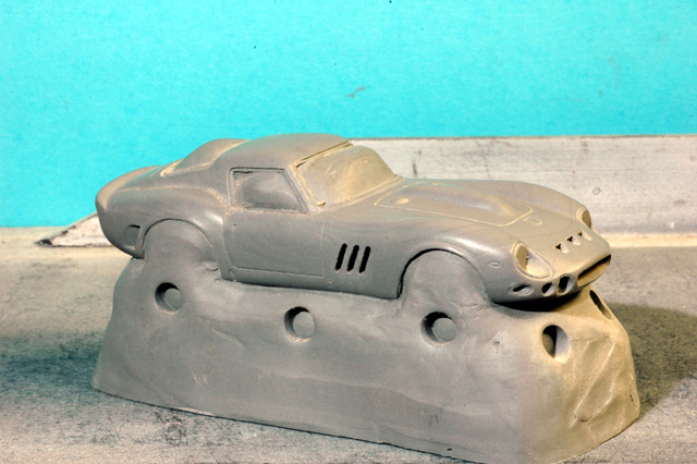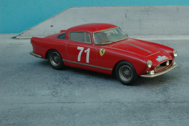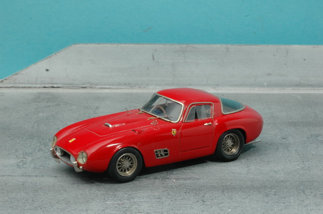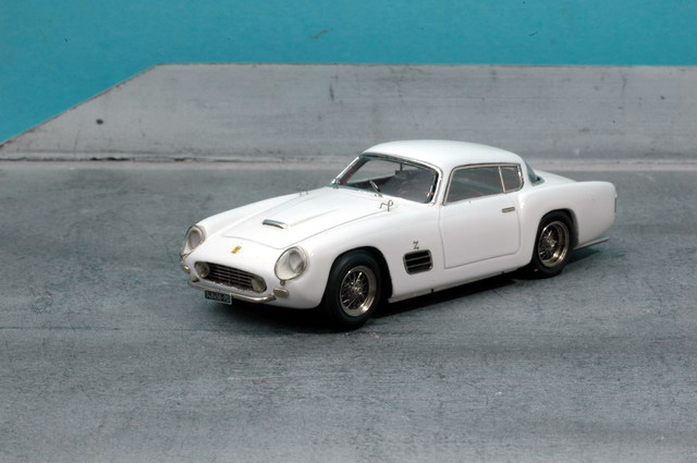 Son histoire est assez longue: La voiture étant chez Mr Bardinon, collectionneur réputé de Ferrari "échelle 1", je lui demandais la possibilité de venir photographier la belle et prendre des cotes.. Je dus y aller 2 fois: Non seulement les photos furent moyennes en qualité la première fois (c'était l'appareil du frangin, jamais voulu fonctionner avec moi!), mais en prime, lors de la création du modèle, je butais sur un problème de forme, quelque chose n'allait pas dans les proportions... les bouquins donnaient tous pour cette voiture et ses sœurs spider un empattement de 2m35, et ça ne collait pas avec les photos. Je retournais donc là-bas vérifier l'empattement, ce que je n'avais pas fait en premier lieu, pour me rendre compte que l'empattement était de 2m40... J'appris cette fois-là deux choses: Toujours vérifier les cotes au complet, et ne pas se fier aveuglément aux bouquins, fussent-ils écrits par des pointures reconnues! Ah! et une troisième: Toujours doubler les photos avec des réglages différents, sans trop se fier aux modes automatiques... Les nombreux spots du musée avaient par trop influencé ma cellule!